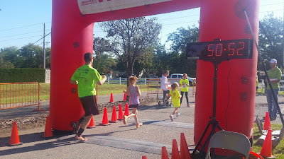 Skogen and I ran together for the second year in a row. We were trying to beat last year's time, but Skogen ate two donuts before we started the race (without me knowing) and he felt sick the whole first mile! A little while after we reached the first mile mark, Skogen threw up, so we stopped to walk and catch his breath for a little while. After the drink stand, we were able to start up running again, but a short while later, he had to go pee! He cried the whole last mile. I encouraged him to pee his pants like real runners do sometimes, but he didn't want the pee to sting his legs! It was a loooooooooooooooong 3.1 miles for him, but we made it (although several minutes later than last year's time) and it felt good to cross the finish line! I was so proud of Skogen for sticking it out, even though he was uncomfortable.